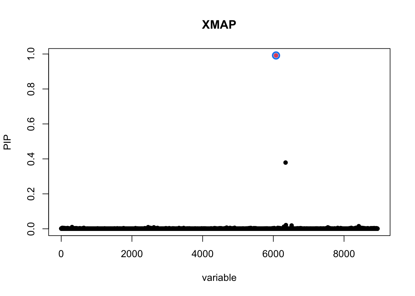 plot_CS(pip_xmap, cs_xmap, main = "XMAP",b = (info$rsid == "rs900776"))
